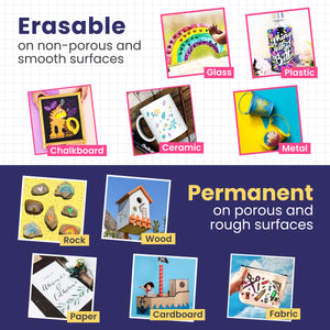 Use the color markers to mark expiration dates on canisters and containers, leave personal notes on mirrors or windows, mark on ceramics, plastics, glass doors, gym boards, business folders, mason jars, mugs, and any other non-porous surface.
