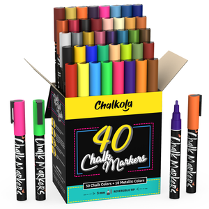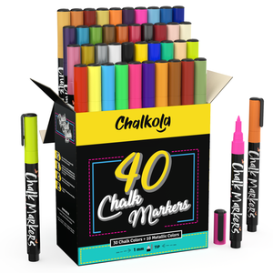 From bright neons to dreamy pastels and shimmering metallics, this 40-pack set of versatile chalk pens has every color you need to create vibrant artworks for home, work, school, or play. Compared to dull and dusty regular chalk, these chalkboard markers are non-toxic, kid-safe, easy to clean, and work great on any non-porous surface. Use them to design kitchenware, ceramics, party favors, signages, ornaments, cafe menus, mirrors, windows, and other things–the fun and creative possibilities are endless.