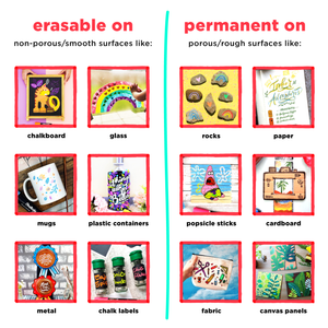 Whether you’re a mom looking for holiday decorating with kids, clean alternative to standard chalk or paint for the kids, a teacher on a quest for the most sought-after education classroom supplies, or a business, office or restaurant owner trying to advertise and attract customers to your new product or bar menu item, our markers make creating beautiful, fun messages and designs effortless.